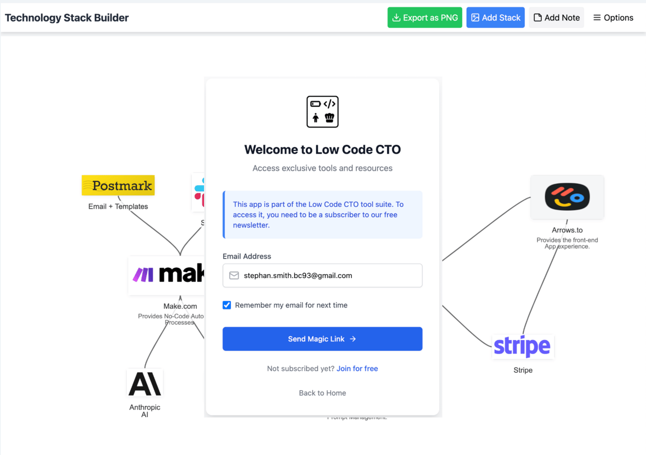 FYI - Magic links are single-use email links that enable a user to log in via an email message. Simple but very very user friendly. No password needed.Each time I spin up an application, I want to restrict access to only my Beehiiv members. I can provide a simple magic link workflow. The Application knows that it needs to restrict access to the App, and to give the user an easy way to log in, they provide their email addresses.
