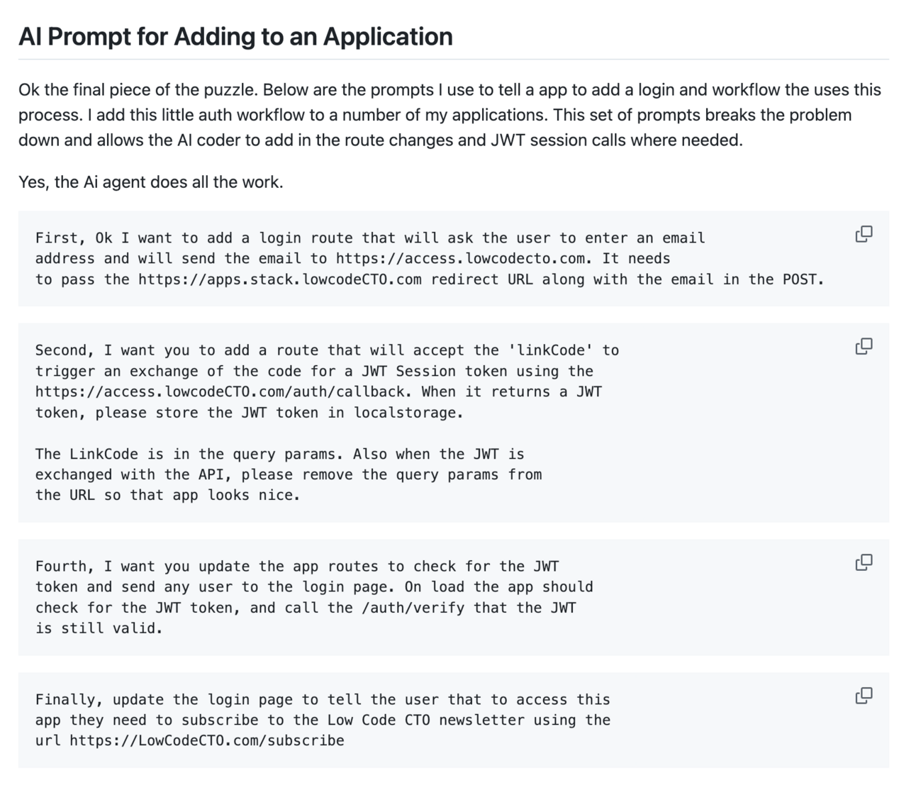 Below is a screenshot of the AI prompts I use to tell a new Bolt.new app to use my little Beehiiv identity workflow.